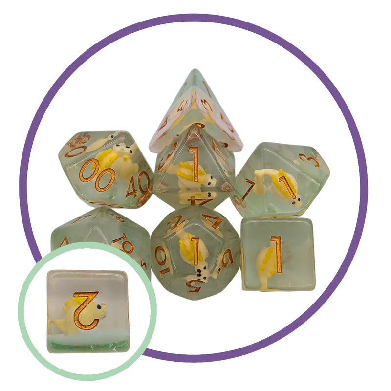 Filled/Inclusion RPG Style Standard 16mm 7pc Polyhedral Set - contains a D4, D6, D8, D10, D%, D12 & D20.