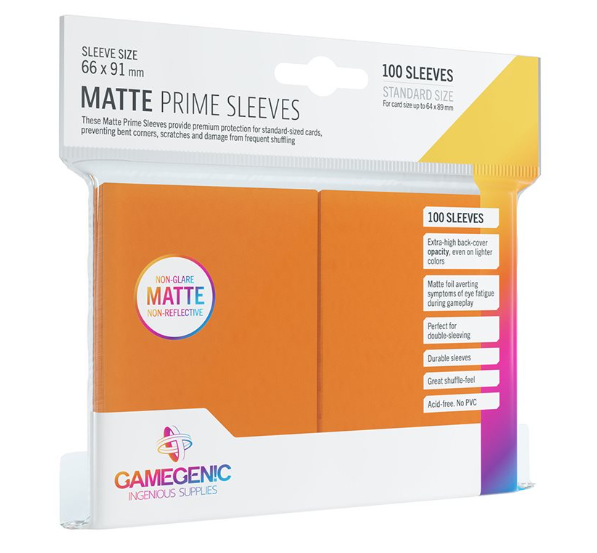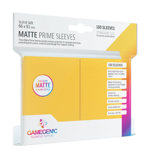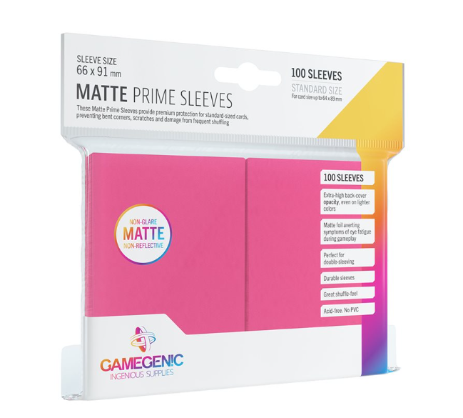 Card-sleeves are an essential requirement to protect your valuable gaming cards. These Matte Prime Sleeves provide a premium protection for standard-sized cards and prevent them from bent corners, scratches or damages by frequent shuffling. The matte front blocks annoying reflections at the sleeves, to ensure that the card is visible from all sides and avoiding symptoms of eye fatigue during gameplay. Due to their fine, matte back side players will experience a great shuffle feel and don't to have struggle with slipping deck staples. The sleeves are optimized in size to ensure a professional protection and work perfectly for double-sleeving (sleeve-within-sleeve). One pack contains 100 sleeves, matching also larger deck formats.